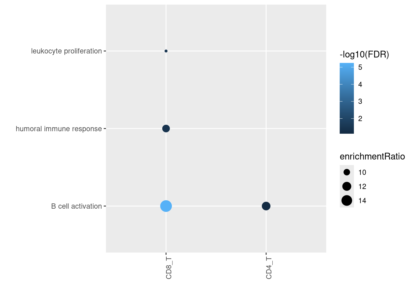 In summary, genes with higher expression in lungs are broadly enriched for T cell related functions, while those in spleens are broadly enriched for B cell related functions. We still see lung up-regulated genes enriched in pathways of heat-shock protein genes. Overall, the GO enrichment results are consistent between bulk or single-cell approach.
