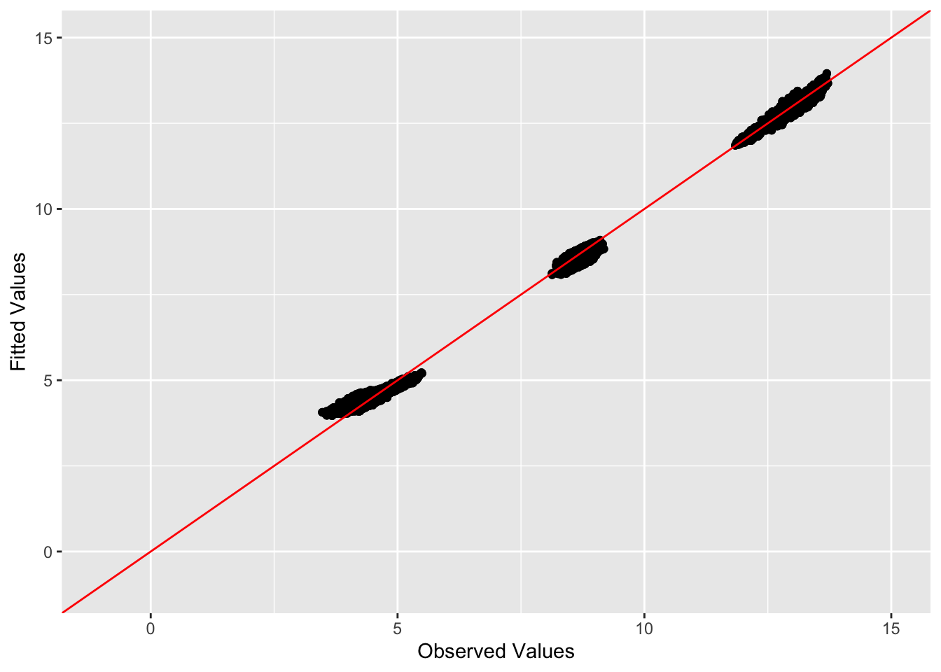 ggplot(data = NULL, aes(x = c(sim_data$YYt)[off_diag_idx], y = c(symebcovmf_tree_refit_fitted_vals)[off_diag_idx])) + geom_point() + ylim(-1, 15) + xlim(-1,15) + xlab('Observed Values') + ylab('Fitted Values') + geom_abline(slope = 1, intercept = 0, color = 'red')