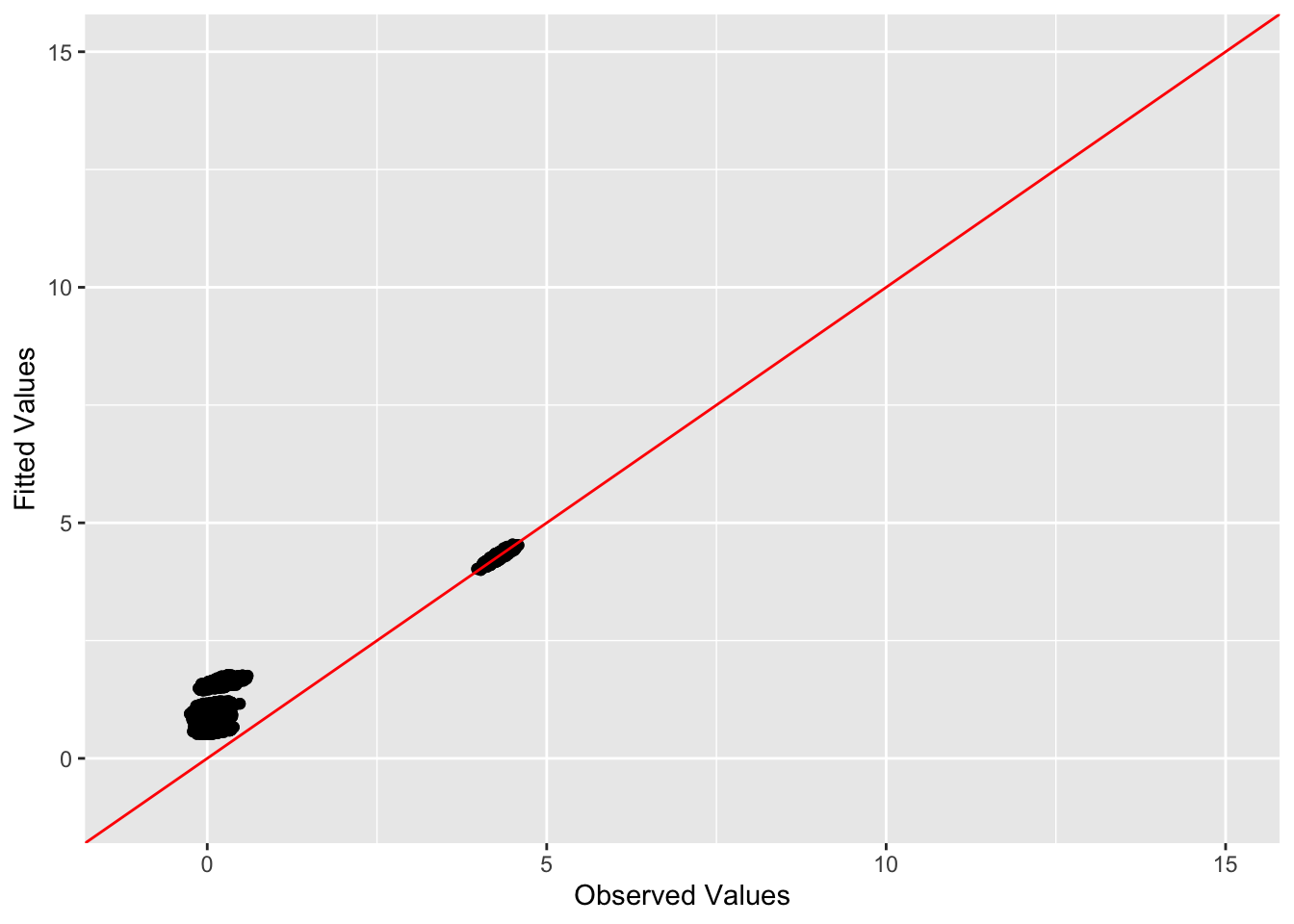 ggplot(data = NULL, aes(x = c(sim_data$YYt)[off_diag_idx], y = c(symebcovmf_bal_fitted_vals)[off_diag_idx])) + geom_point() + ylim(-1, 15) + xlim(-1,15) + xlab('Observed Values') + ylab('Fitted Values') + geom_abline(slope = 1, intercept = 0, color = 'red')
