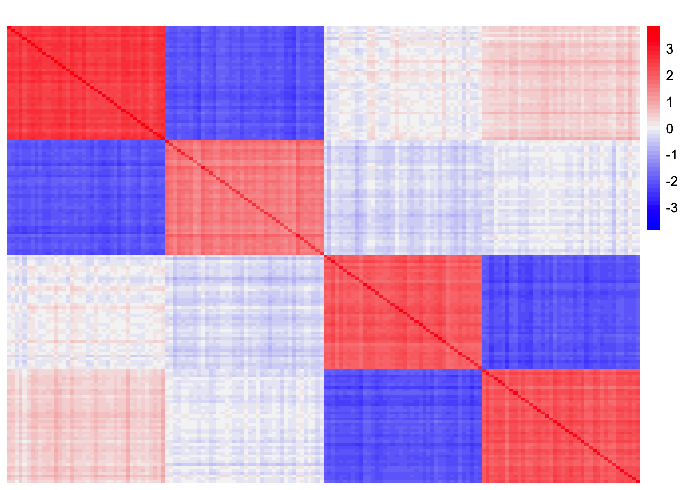 plot_heatmap(sim_data$YYt, colors_range = c('blue','gray96','red'), brks = seq(-max(abs(sim_data$YYt)), max(abs(sim_data$YYt)), length.out = 50))