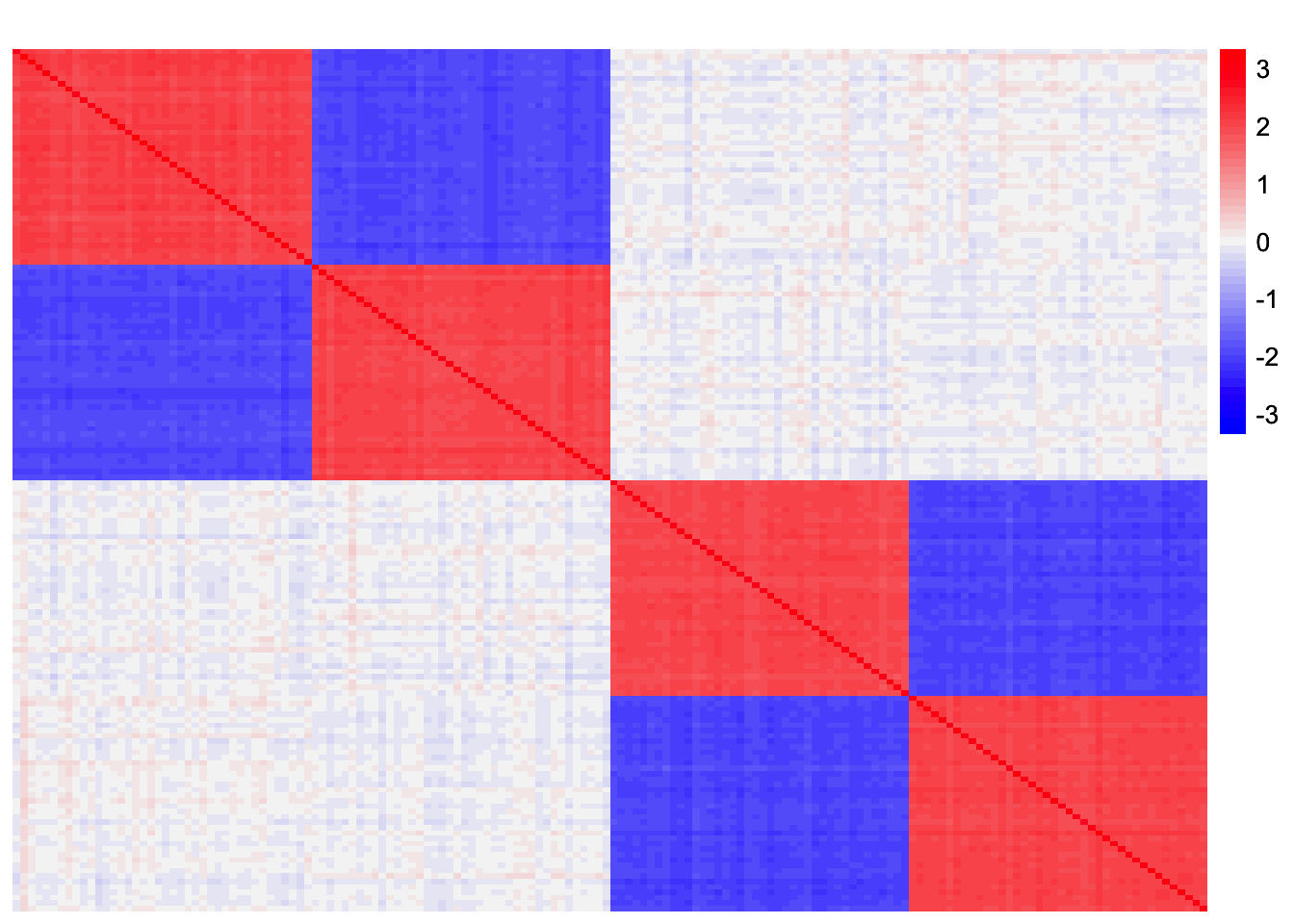plot_heatmap(sim_data_orthog$YYt, colors_range = c('blue','gray96','red'), brks = seq(-max(abs(sim_data_orthog$YYt)), max(abs(sim_data_orthog$YYt)), length.out = 50))