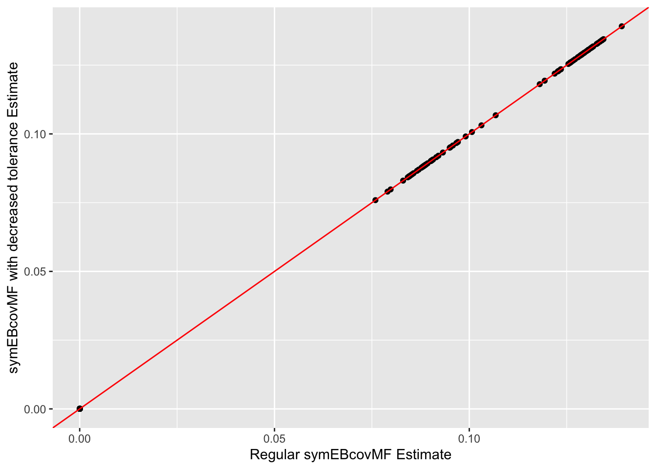 When applying symEBcovMF with generalized binary prior to tree data, I found that instead of population effect factors, the method would group two population effects together. I tried using the point-exponential prior to remedy this, but found that the point-exponential prior also found factors which grouped two population effects. Therefore, I am interested in exploring the following questions: 1) does the method prefer this over solution over our desired solution? does it have a higher elbo? 2) does decreasing the convergence tolerance fix this? 3) how often does this happen?