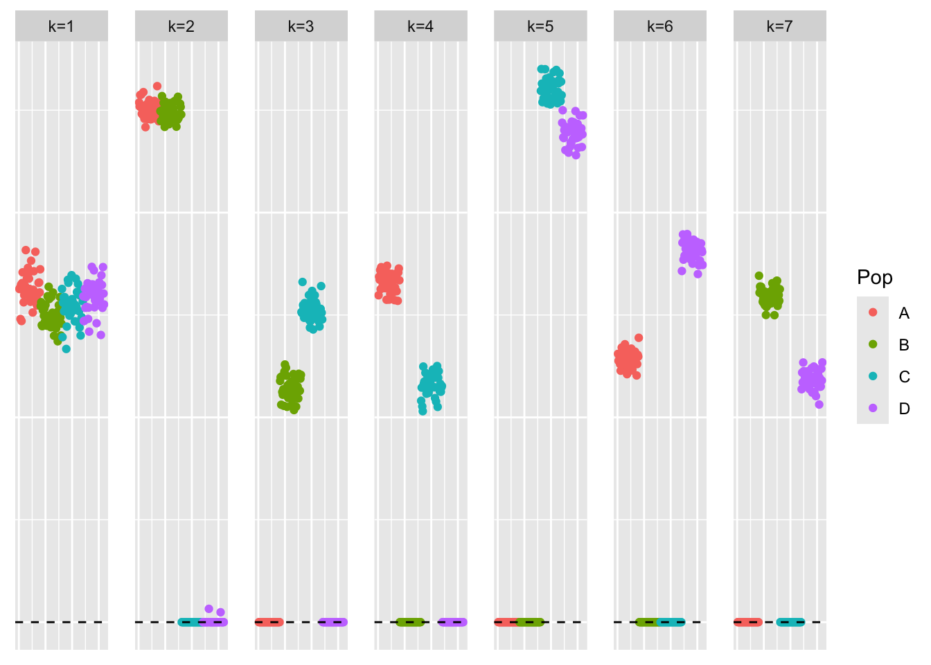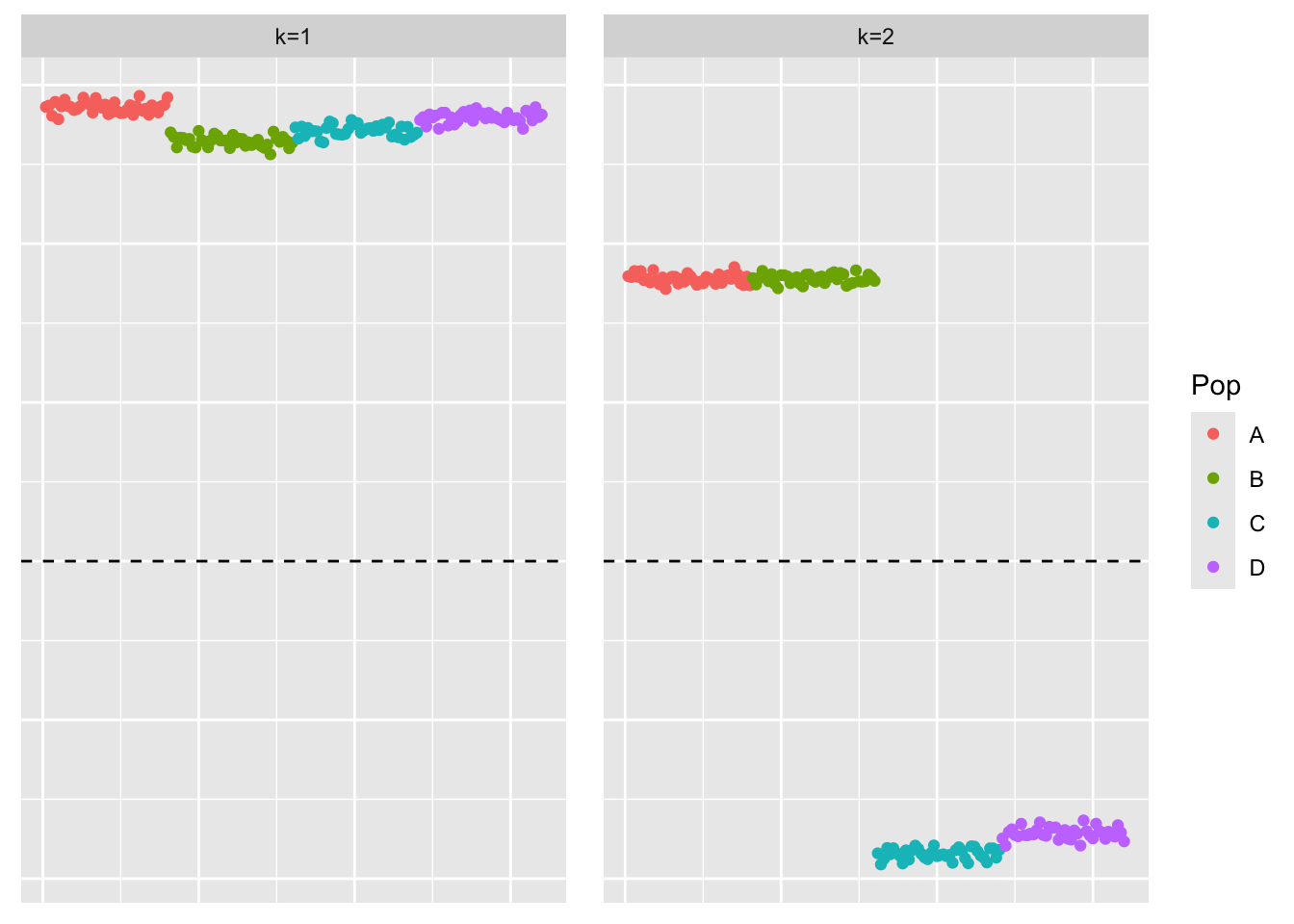plot_loadings(symebcovmf_rank2_fit$L_pm %*% diag(sqrt(symebcovmf_rank2_fit$lambda)), pop_vec)