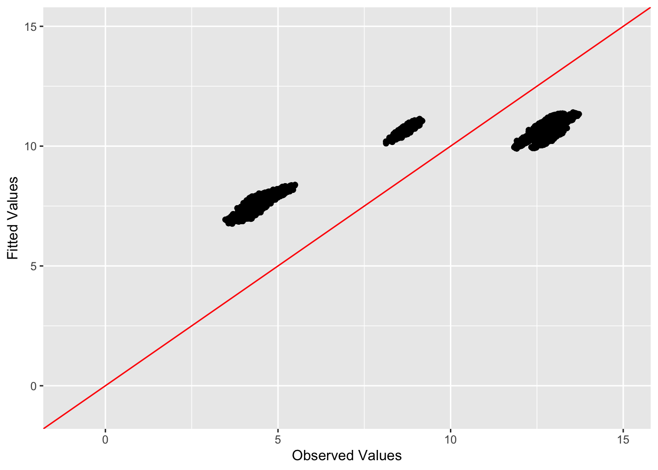 ggplot(data = NULL, aes(x = c(sim_data$YYt)[off_diag_idx], y = c(symebcovmf_tree_fitted_vals)[off_diag_idx])) + geom_point() + ylim(-1, 15) + xlim(-1,15) + xlab('Observed Values') + ylab('Fitted Values') + geom_abline(slope = 1, intercept = 0, color = 'red')