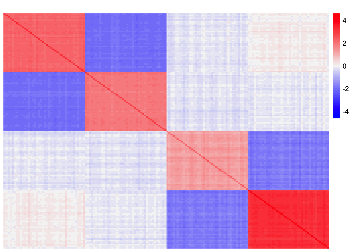 plot_heatmap(sim_data$YYt, colors_range = c('blue','gray96','red'), brks = seq(-max(abs(sim_data$YYt)), max(abs(sim_data$YYt)), length.out = 50))