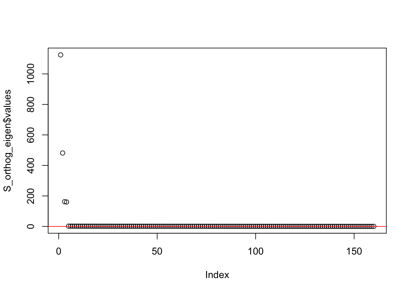 plot(S_orthog_eigen$values) + abline(a = 0, b = 0, col = 'red')