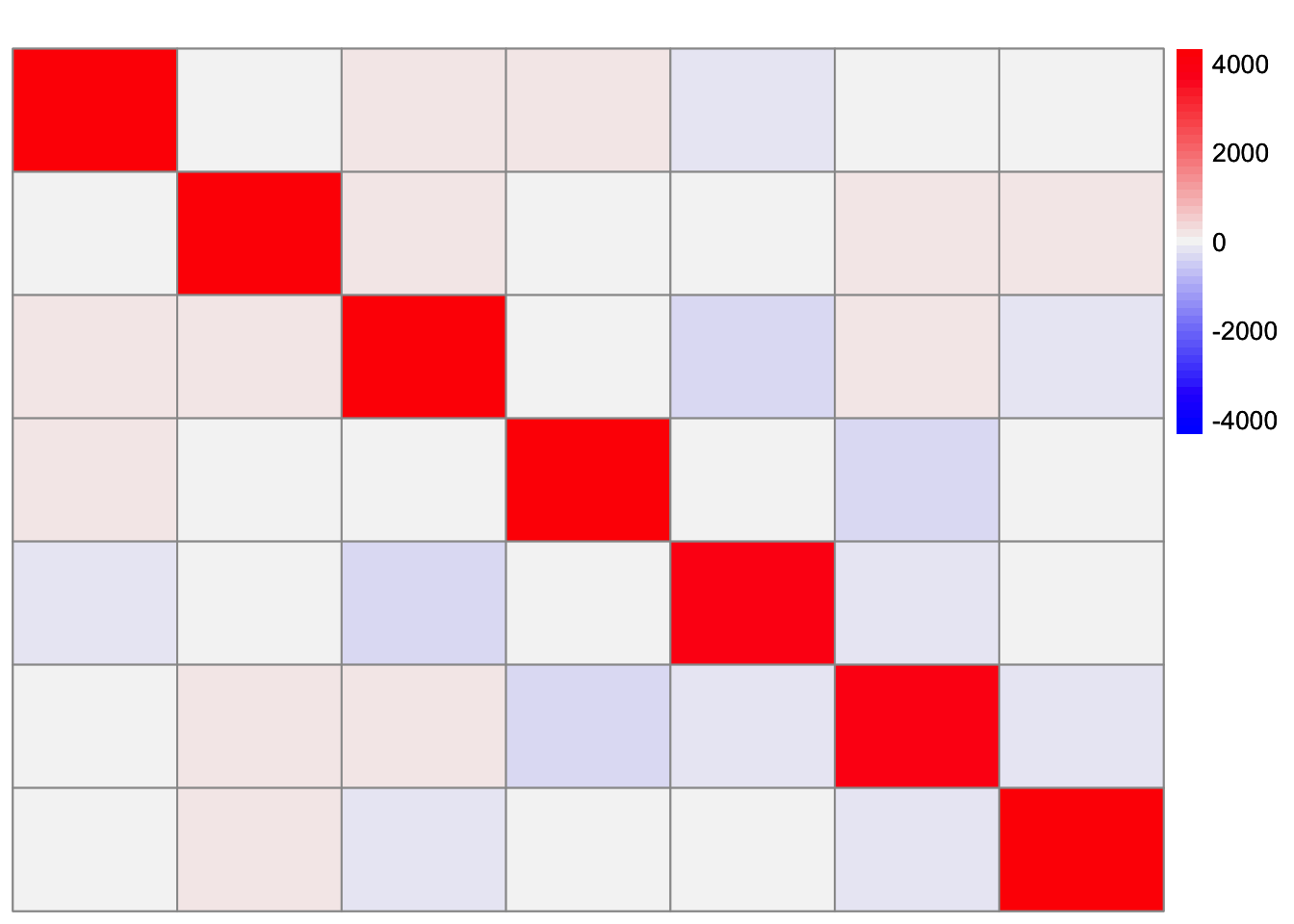 plot_heatmap(FtF, colors_range = c('blue','gray96','red'), brks = seq(-max(abs(FtF)), max(abs(FtF)), length.out = 50))