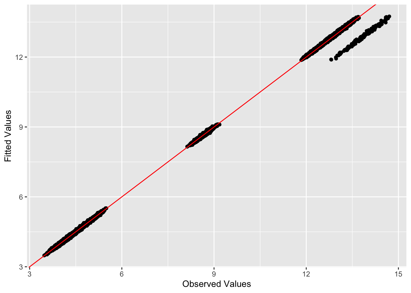 ggplot(data = NULL, aes(x = as.vector(sim_data$YYt), y = as.vector(true_init_gram_est))) + geom_point() + geom_abline(slope = 1, intercept = 0, color = 'red') + xlab('Observed Values') + ylab('Fitted Values')