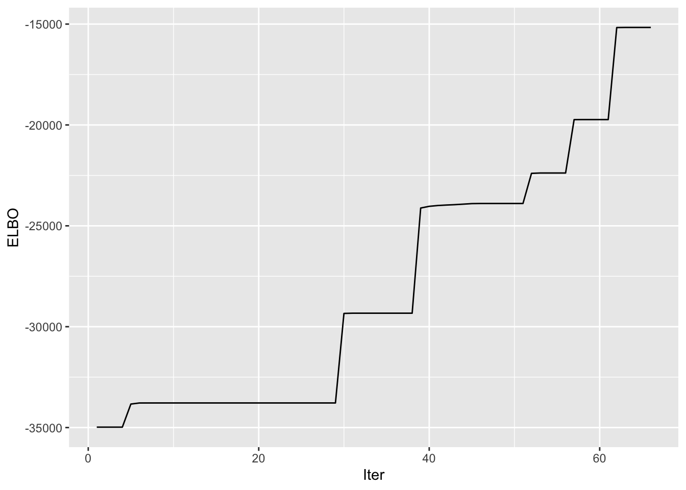 ggplot() + geom_line(data = NULL, aes(x = 1:length(symebcovmf_tree_full_elbo_vec), y = symebcovmf_tree_full_elbo_vec)) + xlab('Iter') + ylab('ELBO')