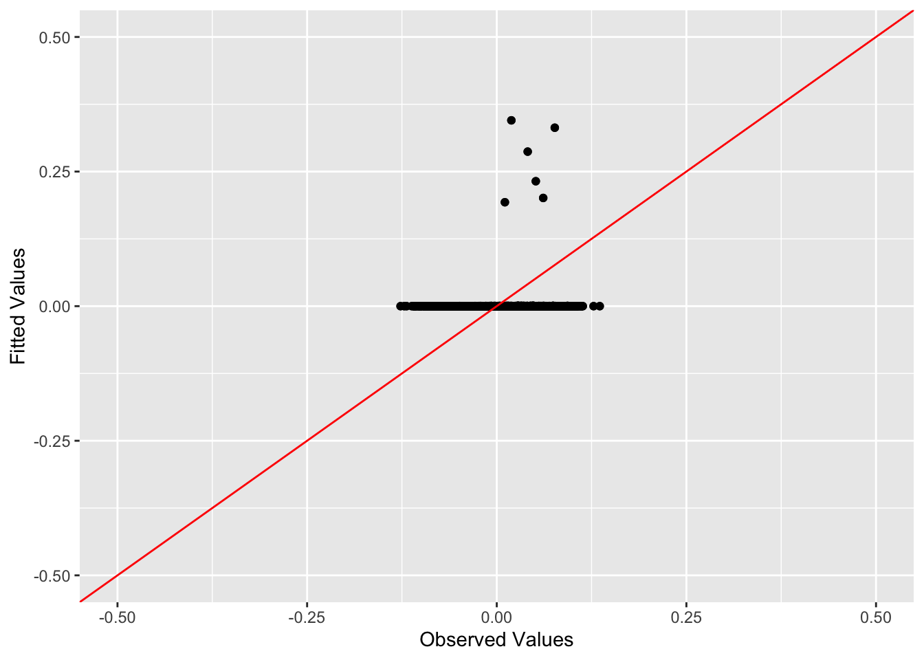 This is a scatter plot of fitted values vs. observed values for the off-diagonal entries: