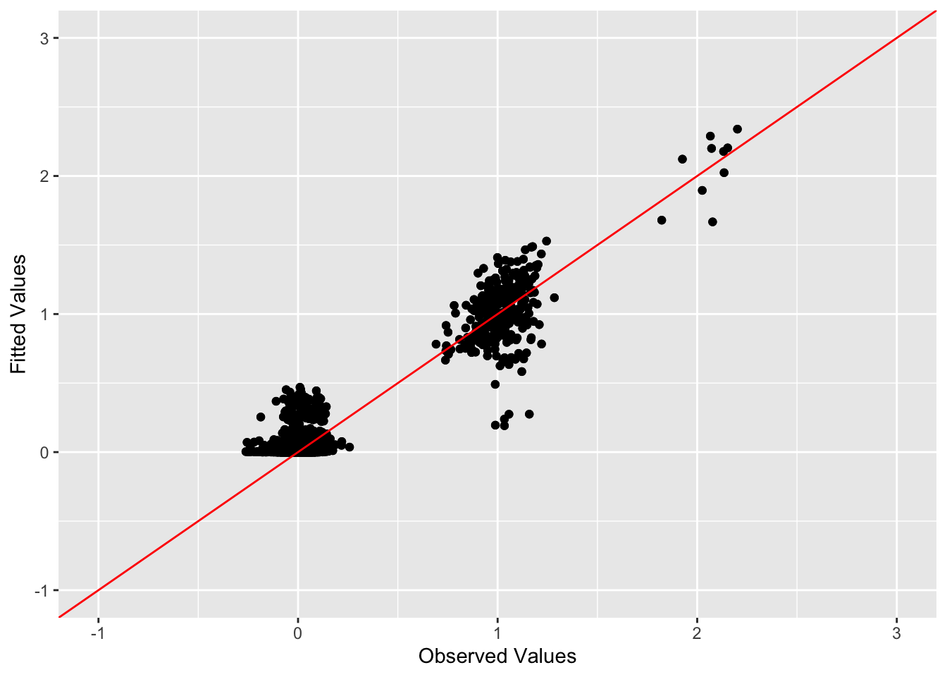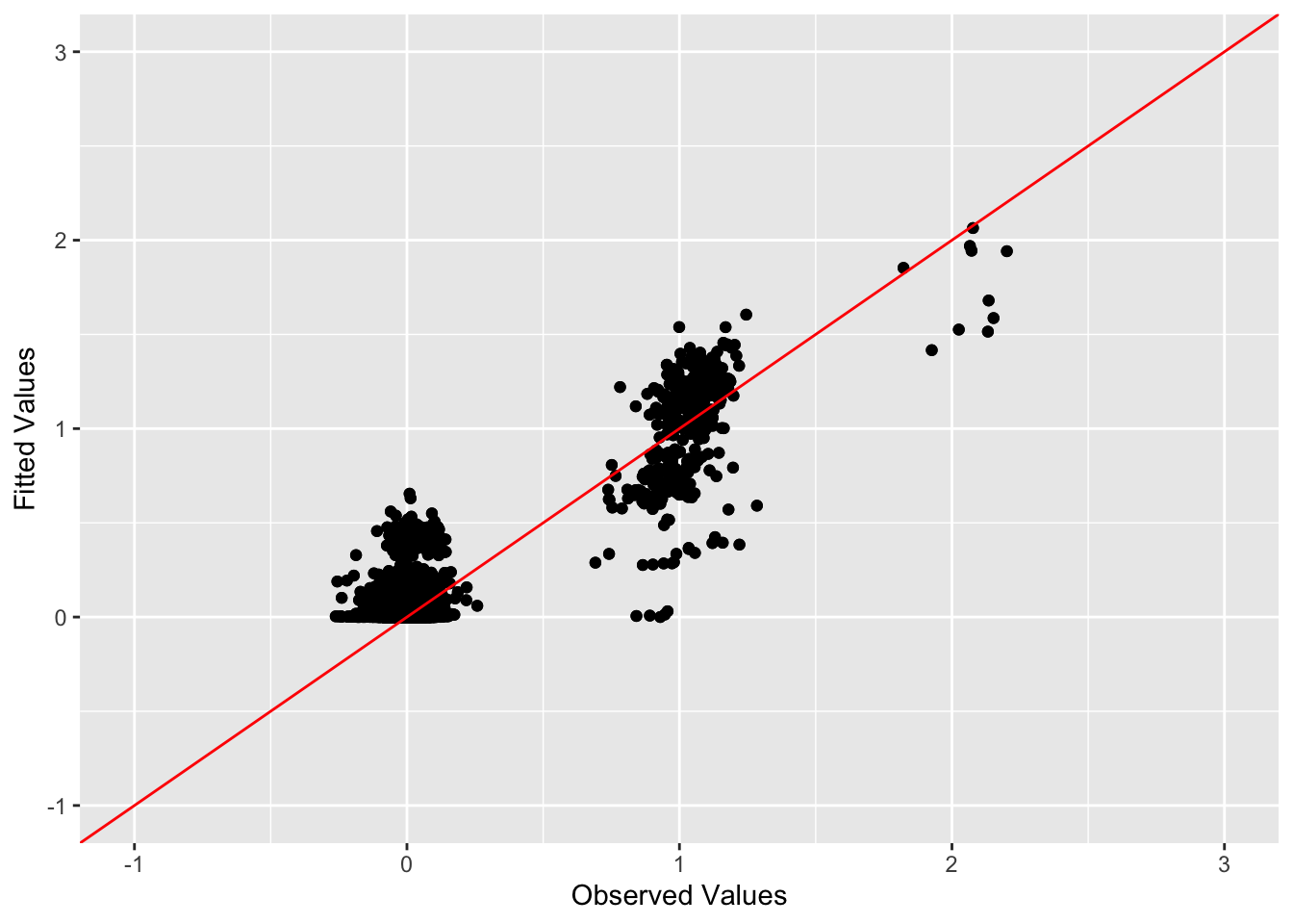 ggplot(data = NULL, aes(x = c(sim_data$YYt)[off_diag_idx], y = c(symebcovmf_overlap_refit_fitted_vals)[off_diag_idx])) + geom_point() + ylim(-1, 3) + xlim(-1,3) + xlab('Observed Values') + ylab('Fitted Values') + geom_abline(slope = 1, intercept = 0, color = 'red')