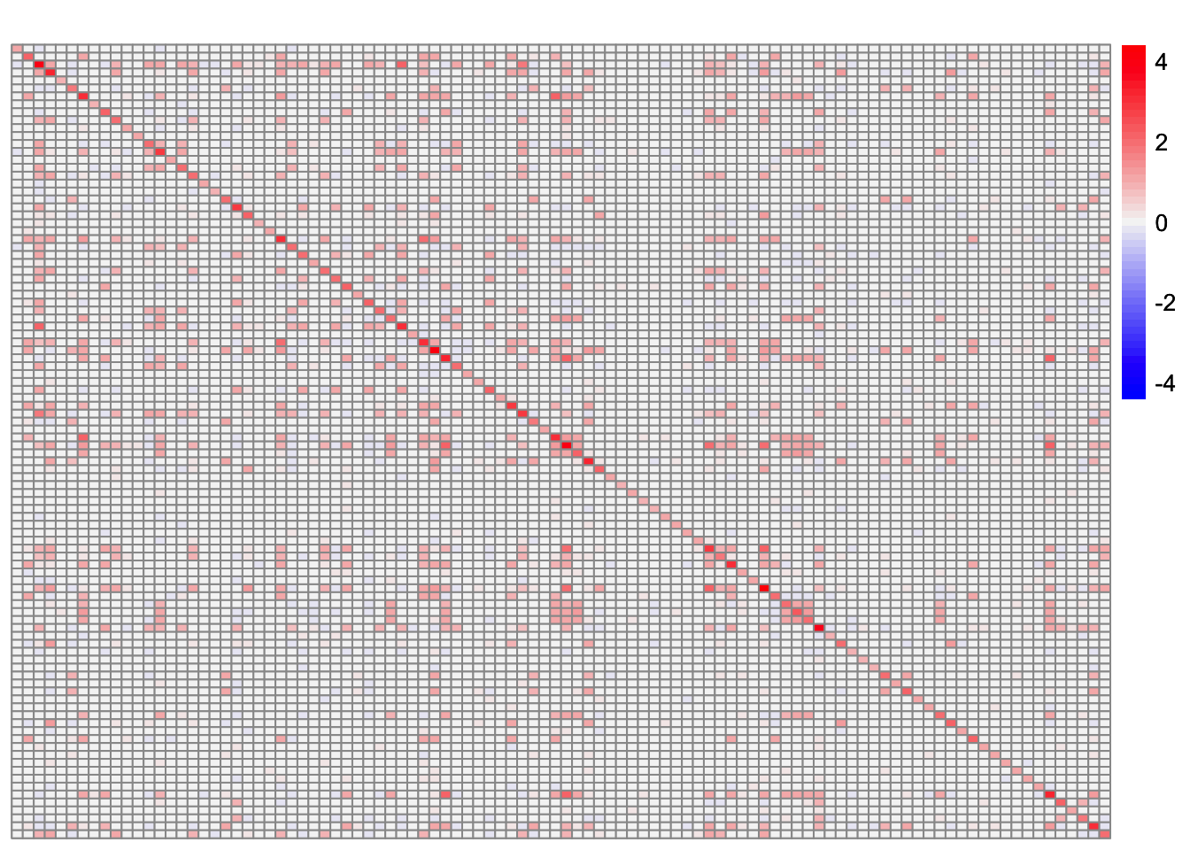plot_heatmap(sim_data$YYt, colors_range = c('blue','gray96','red'), brks = seq(-max(abs(sim_data$YYt)), max(abs(sim_data$YYt)), length.out = 50))