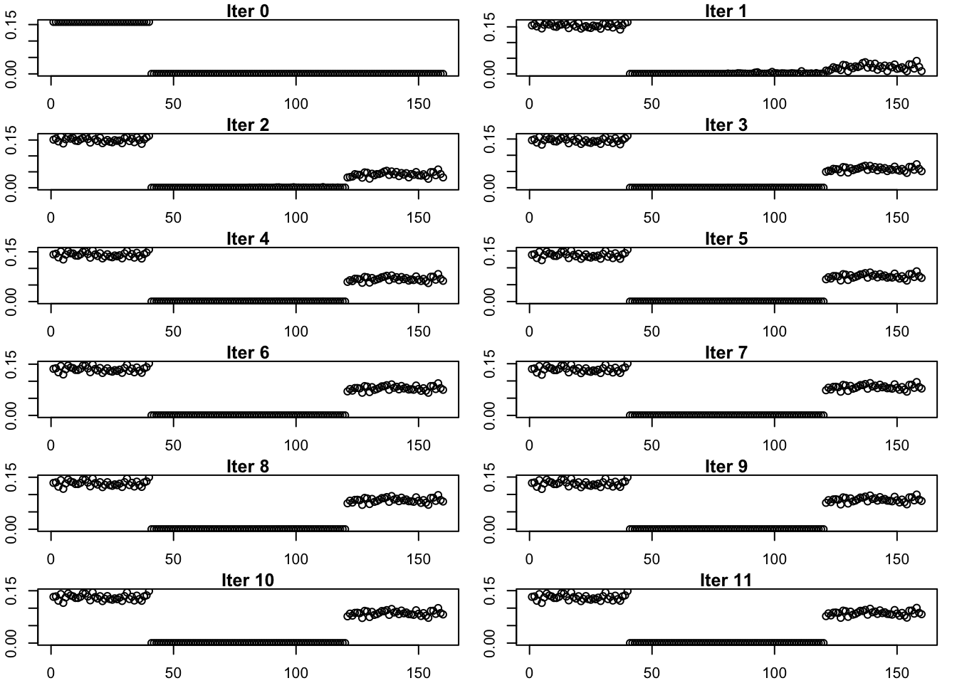 plot(estimates_binormal_exp_true_init_list[[i]], main = paste('Iter', (i-1)), ylab = 'L')