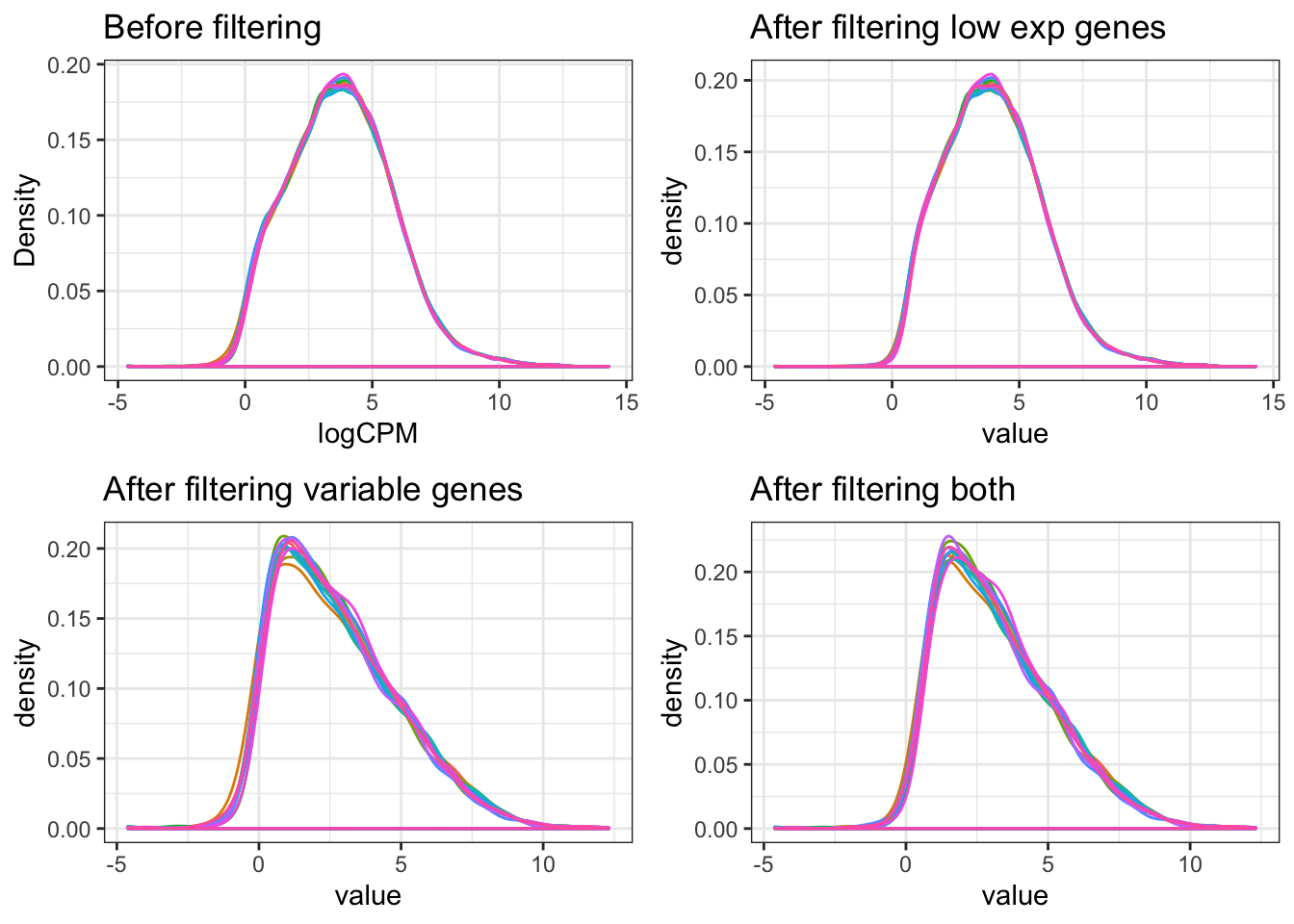 # Density plot of the gene expression distribution after filtering out low expressed genes.