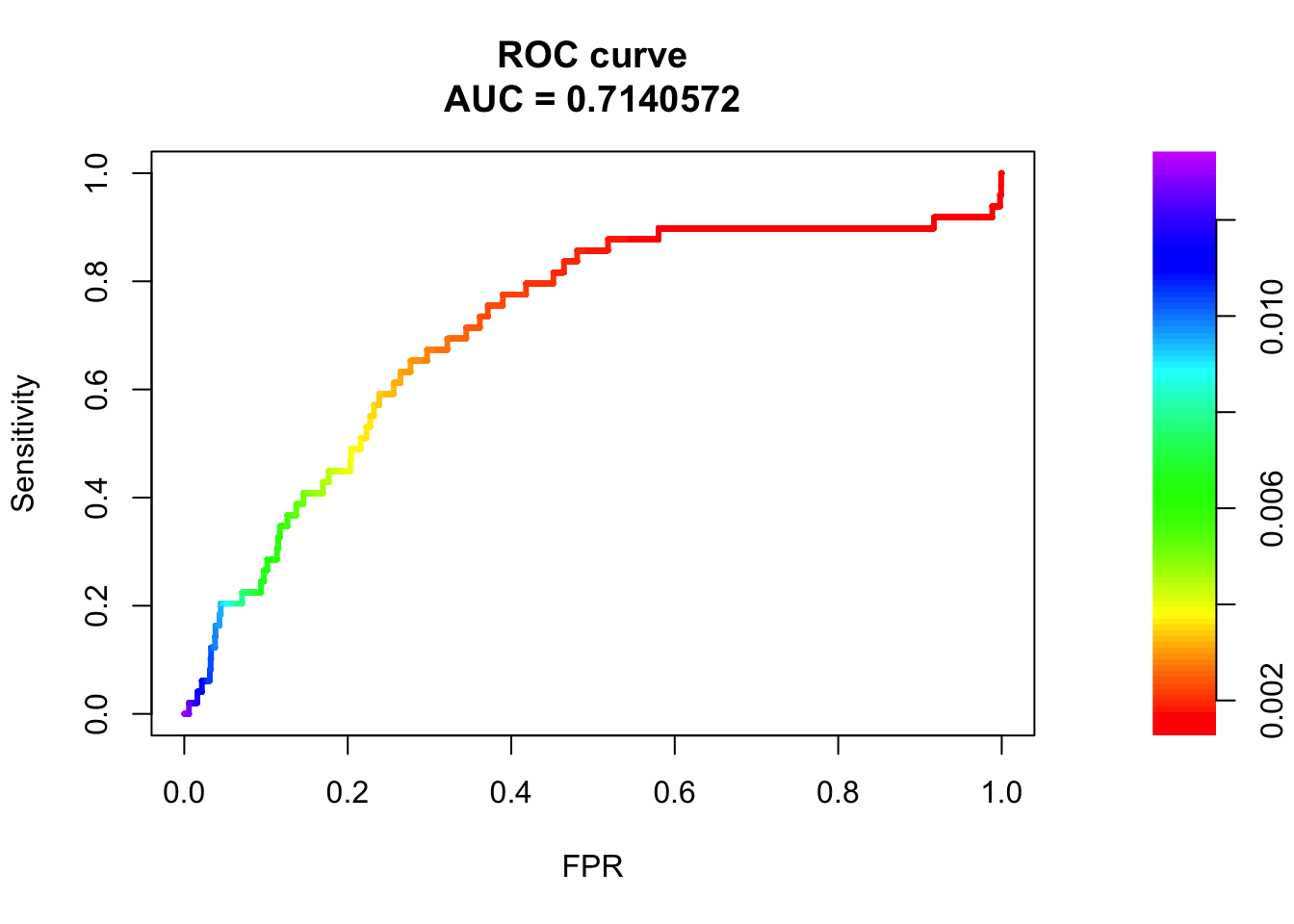roc <- roc.curve(scores.class0 = fg, scores.class1 = bg, curve = T)
