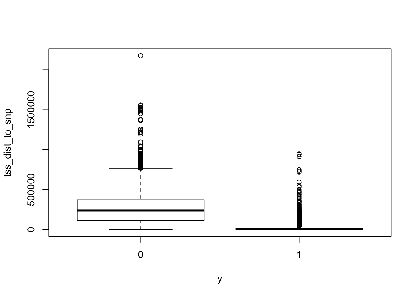 boxplot(tss_dist_to_snp ~ y, data = dat)
