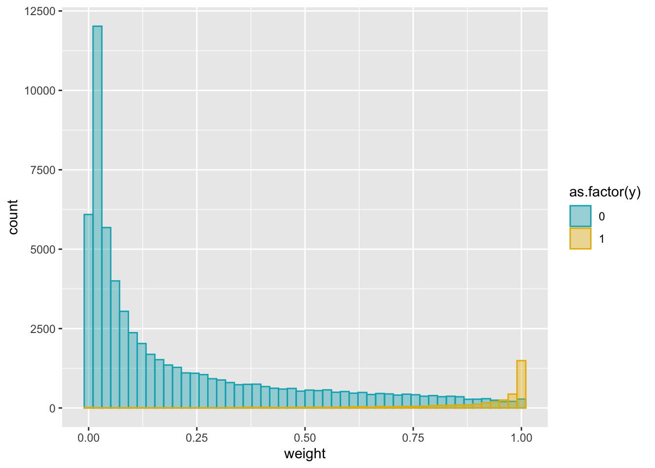 geom_histogram(aes(color = as.factor(y), fill = as.factor(y)),