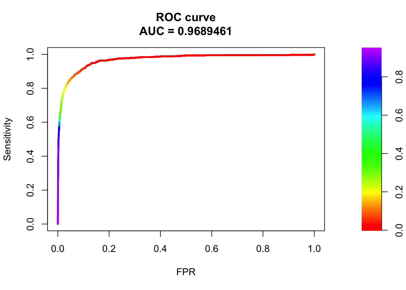 roc <- roc.curve(scores.class0 = fg, scores.class1 = bg, curve = T)