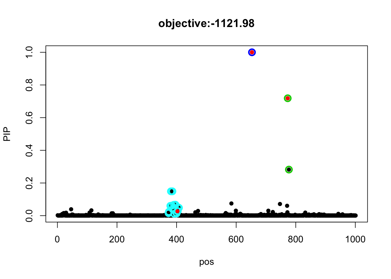 susie_plot(fit1, y = 'PIP', b=b, main=paste0('objective:', round(susie_get_objective(fit1), 2)))