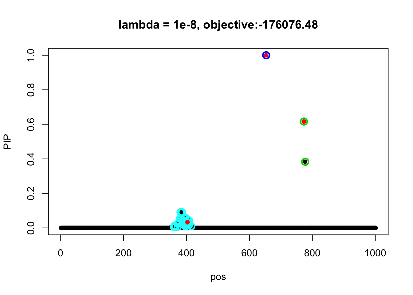 susie_plot(fit2, y = 'PIP', b=b, main=paste0('lambda = 1e-8, objective:', round(susie_get_objective(fit2), 2)))
