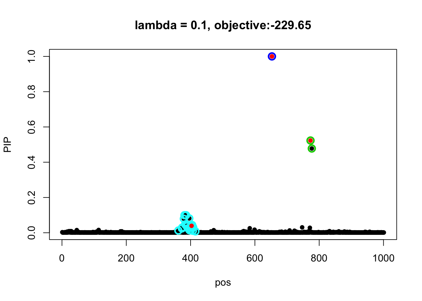 susie_plot(fit4, y = 'PIP', b=b, main=paste0('lambda = 0.1, objective:', round(susie_get_objective(fit4), 2)))