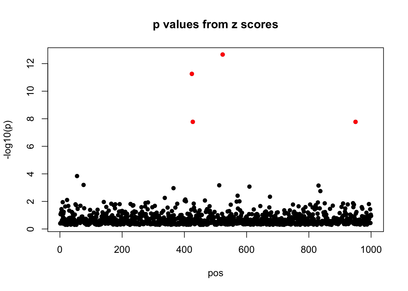 points(pos[beta!=0],zscores[beta!=0],col=2,pch=16)