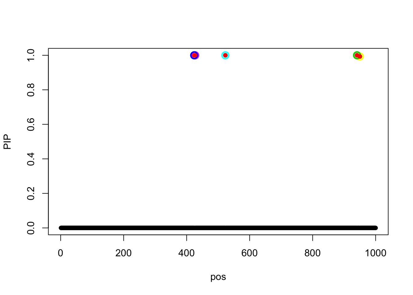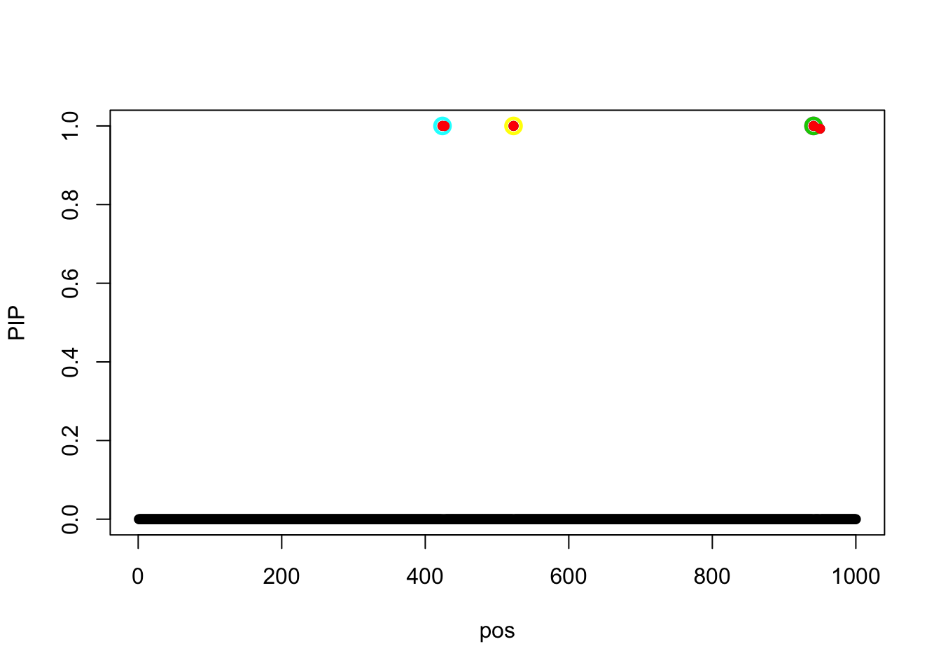 We randomly generated 1200 by 1000 matrix X, each entry is random from N(0,1). The variables are independent. There are 5 signals in the simulated data, total PVE is 0.8. The true signals are 424, 427, 523, 941, 950.