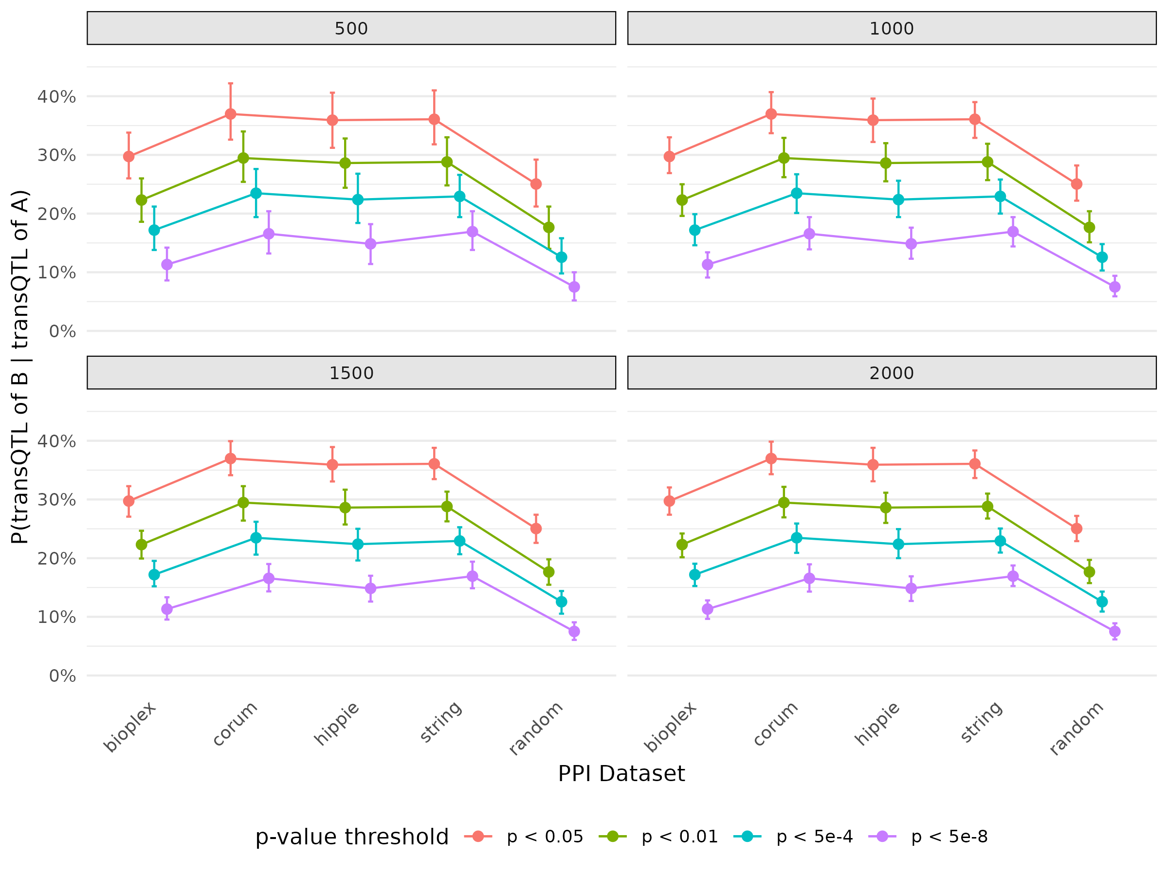 After fisrt 2 steps, there will be a pair of pvalues, then calculate the proportion that both pvalues are significant under certain pvalue threshold, i.e. the probability of there is transQTL for B given there is transQTL for A.