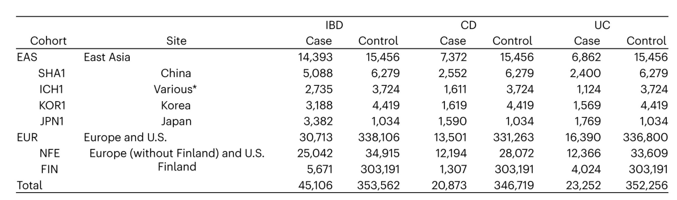 Among the East Asian cohort, there are 14,393 cases and 15,456 controls.